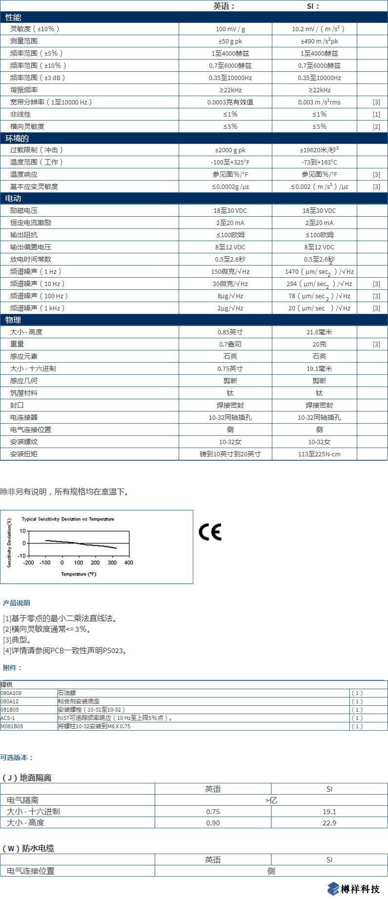 ESS靈敏度,石英剪切ICP?加速,100 mV / g,1至4k Hz,10-32側(cè)連接,至+325?F / + 163?C靈敏度:(±10%)100 mV / g(10.2 mV /(m /s2))測量范圍:±50 g pk(±490 m /s2pk)寬帶分辨率:0.0003 g rms(0.003 m /s2rms)頻率范圍: