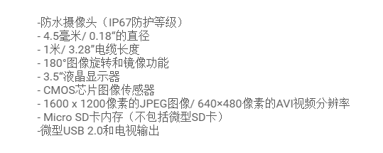 該內(nèi)窺鏡存儲記錄的圖像和視頻直接到micro SD卡內(nèi)存。在1米/ 3.28'的電纜長度和4.5毫米/“直徑0.18允許視頻檢查照相機***的訪問,以查看壁,管道,通風(fēng)孔管道。
