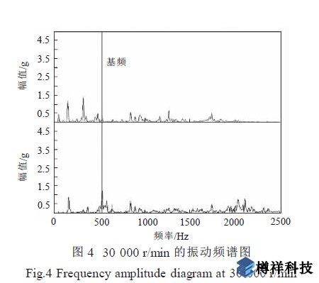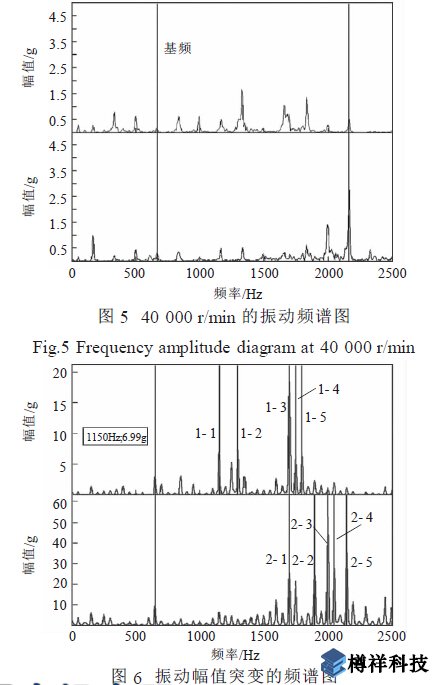 圖4 為穩(wěn)定在30 000 r/min 的振動(dòng)頻譜圖, 圖5為以前試驗(yàn)中穩(wěn)定在40 000 r/min 的振動(dòng)頻譜圖。在這兩幅圖中, 都有低于基頻的頻率成分出現(xiàn), 似乎出現(xiàn)了次諧波振動(dòng)。經(jīng)分析發(fā)現(xiàn), 圖中低于基頻的幅值都是由工頻干擾信號(hào)引起的, 不是異常振動(dòng)信號(hào)。圖4、圖5 中, 從0 Hz~2 500 Hz 的頻帶內(nèi)振動(dòng)幅值都不超過(guò)4g, 沒(méi)有中***頻峰值群出現(xiàn), 基頻振動(dòng)幅小于2g。這說(shuō)明在這兩個(gè)狀態(tài)下, 渦輪增壓器轉(zhuǎn)子系統(tǒng)運(yùn)行正常。