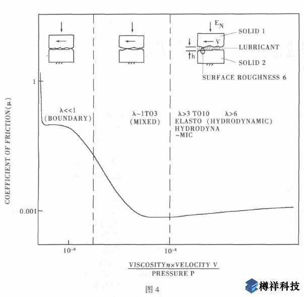 如前所述,Streibeck 曲線的建立是以滑動軸承為基礎(chǔ)的,其橫坐標采用滑動軸承特性數(shù)Zn/p 是很合理的選擇(其意義與Sommerfield 數(shù)ηω/p 相同)。但是隨著摩擦學的發(fā)展,研究對象日益豐富和多樣化,僅用這個參數(shù)來表示摩擦副表面間的隔離程度是具有局限性的。美***的Hamrock 教授提出, 為使Streibeck 曲線更具普遍性,將橫坐標改為油膜厚度與表面粗糙度之比(比膜厚Specific Film Thickness)λ。