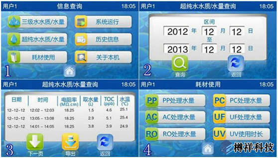 ◇ 在信息查詢畫面中點擊耗材使用,出現(xiàn)耗材使用查詢畫面(圖4),這里提供對PP處理水量,AC處理量,RO處理水量,PC處理水量,UF處理水量,UV使用時長等查詢功能的入口。