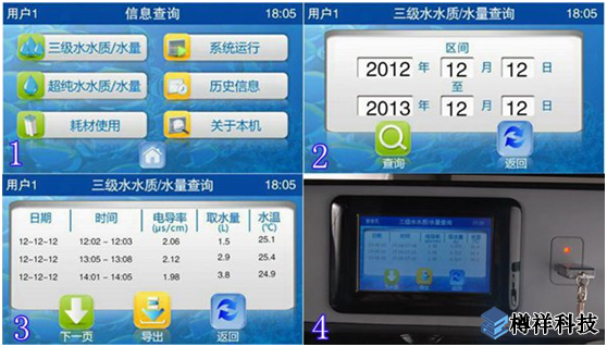 ◇ 在主畫面中點擊信息,出現(xiàn)信息查詢畫面(圖1)。這里提供對三級水水質(zhì)/水量,超純水水質(zhì)/水量,耗材使用,系統(tǒng)運行,歷史信息,關(guān)于本機等查詢功能的入口。