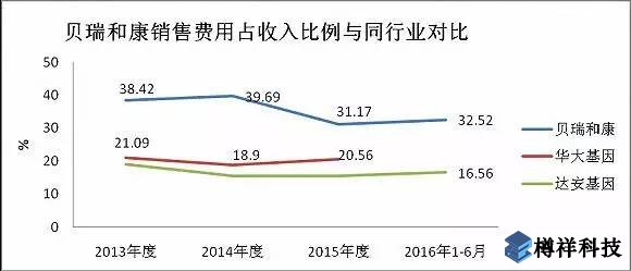 此外,貝瑞和康的業(yè)務(wù)收入很大程度上依賴于其銷售能力。數(shù)據(jù)顯示,相比華大基因20%左右的銷售費用比例(銷售費用占總收入的占比),貝瑞和康的銷售費用比例可以***達(dá)32%,更是比達(dá)安基因(25.980, 0.02, 0.08%)16%左右的銷售比例***出一倍。