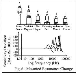 圖中顯示了六種可能的安裝技術(shù)及其對(duì)典型壓電加速度計(jì)響應(yīng)的影響。(請(qǐng)注意,并非所有安裝方法都適用于您的特定傳感器。)